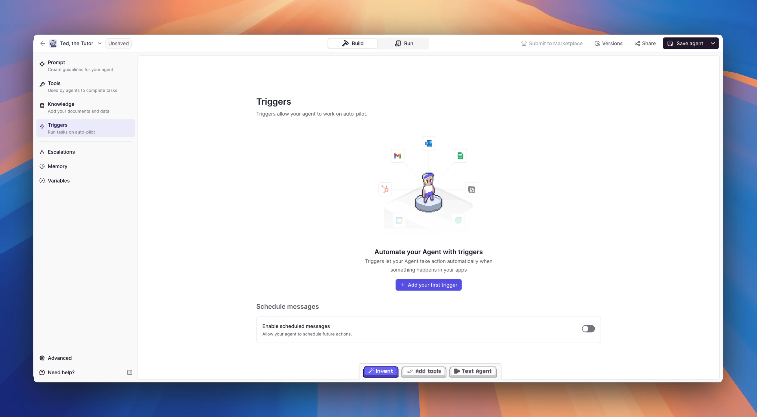 - Agent builder sidebar: Access trigger controls directly while building your agent